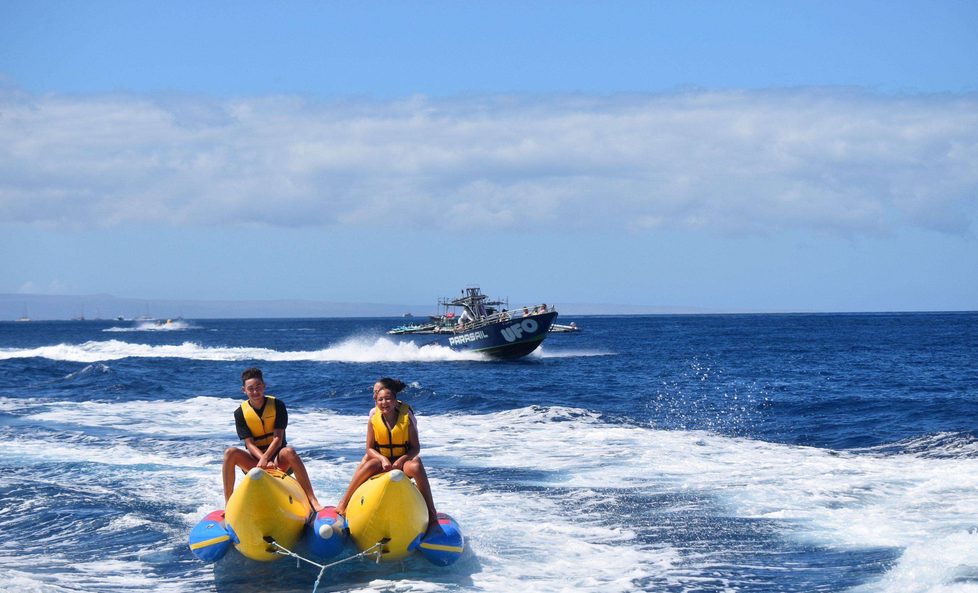 Experience a fun, fast-paced banana boat ride off Kaanapali Beach, perfect for families, friends, and groups looking for a splash of adventure. This nonstop 20-minute ride delivers plenty of excitement, with ocean spray, laughter, and stunning views across the channel to Lānaʻi and Molokaʻi.